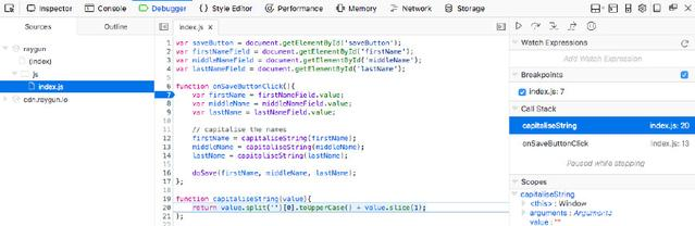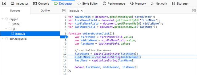 在前一节中,我们从Raygun错误报告中推断出错误来自capitalizeString方法。这种方法被称为三次,所以,哪个实例是罪魁祸首?你可以仔细看看堆栈轨迹,看看它是从第13行发出的导致错误的调用。你知道第13行涉及中间名值。因此,您应该专注于通过正确制作输入来重现错误。