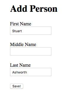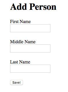 为了演示如何使用Firefox Dev Tools调试应用程序,我将使用一个简单的添加人窗体。这种形式可以让你输入第一个,中间和最后一个名字。点击'保存'按钮后,表单将进行一些处理,数据将被发送到您的(虚拟)服务器。