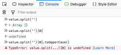 value.split(‘’)在控制台中执行该表达式会显示它返回一个空数组 - 该代码是错误来自的地方!由于返回值是一个空数组,因此我们尝试调用toUpperCase第一个项目(这是未定义的,因为没有项目)会给出错误。
