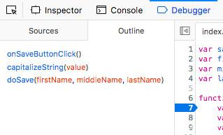 此选项卡的左侧窗格具有加载到页面中的所有源文件的树视图。您可以像在IDE中一样导航这些内容,因为内容显示在中央窗格中。选定脚本后,可以使用此窗格中的“大纲”选项卡查看文件功能的概述。