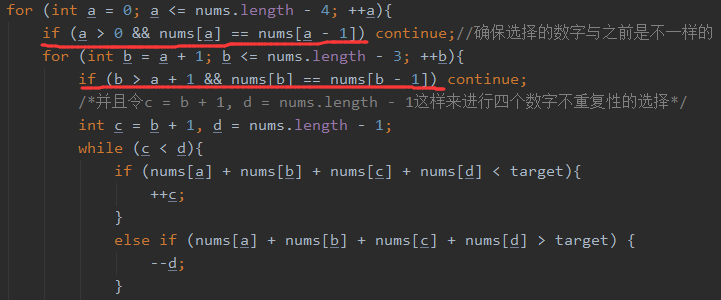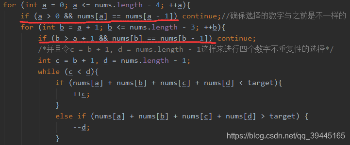 ③ 因为求解的是不重复的组合,所以在循环的时候就应该判断一下是否存在之前使用过这个元素了,因为是从数组中选取四个元素,所以排序之后假如存在着重复那么相邻的元素应该是一样的,所以需要从下一个与之前不重复的元素开始,a,b位置判断去掉重复的如下面划线部分: