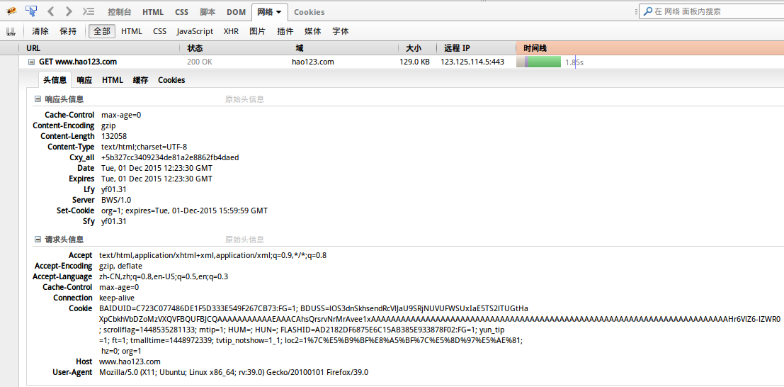 我只是随便点了一个GET的数据来看的,我们可以看到有请求头信息也有响应头信息,这应该就是客户端和服务器之间的请求和响应,我们现在先不必了解这些数据有什么含义,我们只要知道有这么一回事就行了