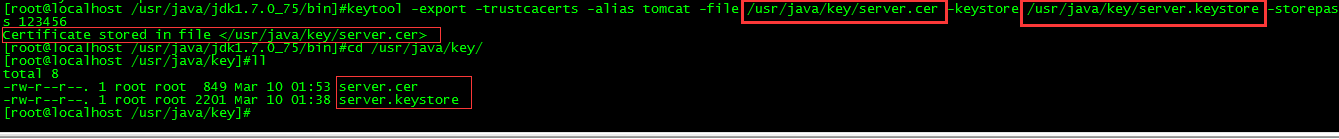 keytool -export -trustcacerts -alias tomcat -file /usr/java/key/server.cer -keystore /usr/java/key/server.keystore -storepass 123456