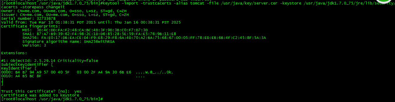 keytool -import -trustcacerts -alias tomcat -file /usr/java/key/server.cer -keystore /usr/java/jdk1.7.0_75/jre/lib/security/cacerts -storepass 123456