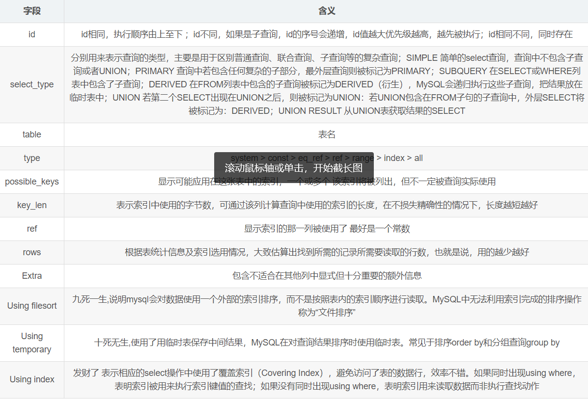 1.查看表的加载顺序 2.查看sql的查询类型 3.哪些索引可能被使用,哪些索引又被实际使用了 4.表之间的引用关系 5.一个表中有多少行被优化器查询 6.其他额外的辅助信息