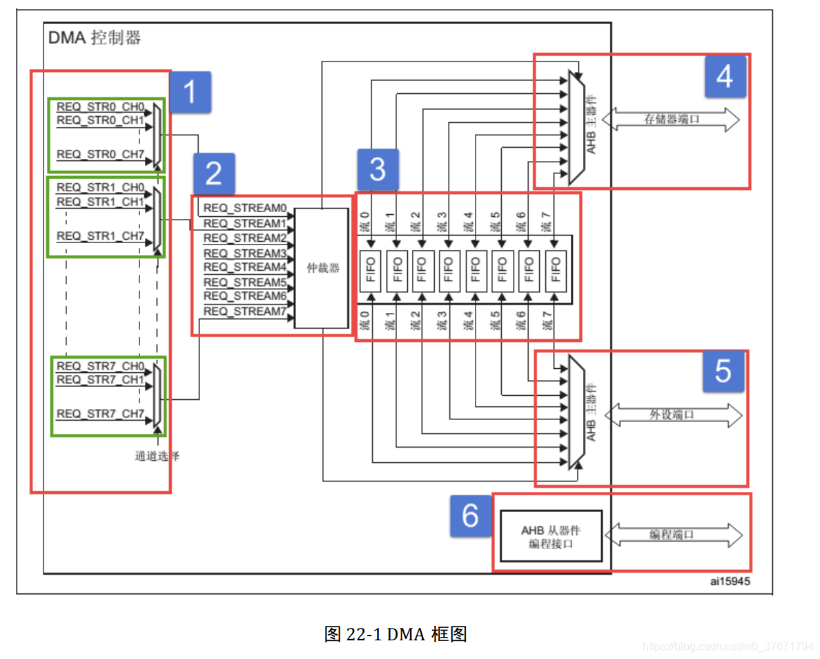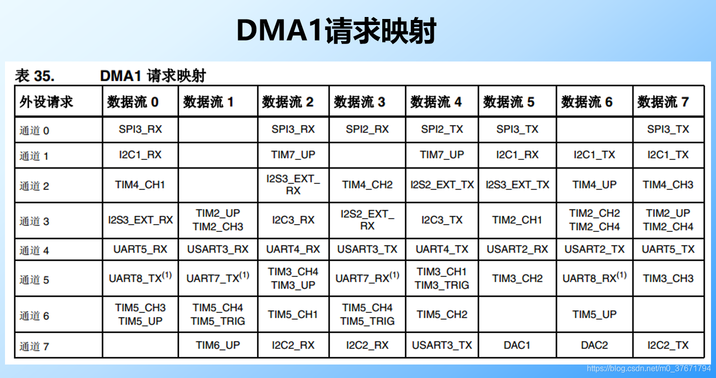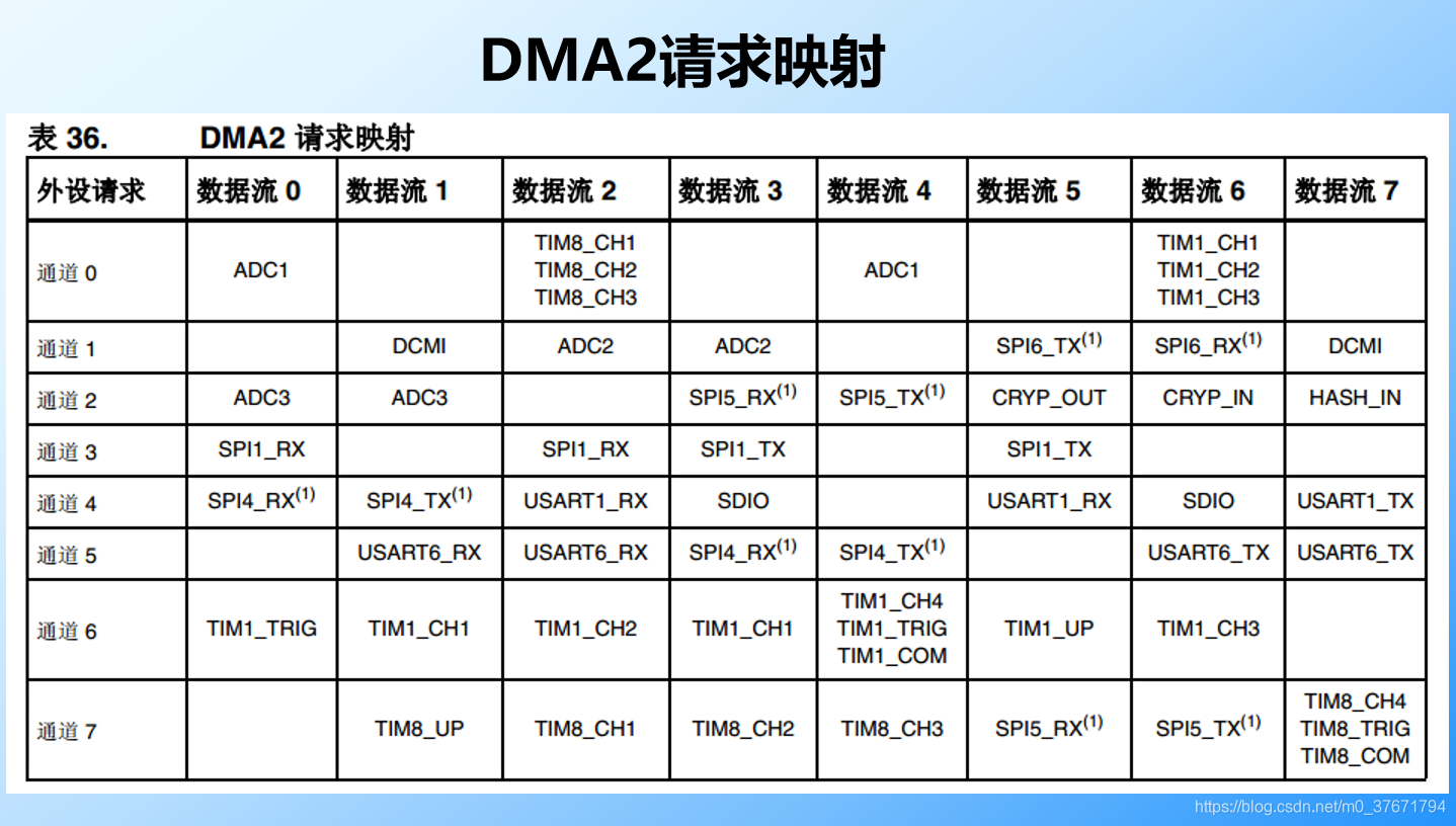 每个DMA控制器具有8个数据流,每个数据流对应8个外设通道,每个通道对应不同的DMA请求。
