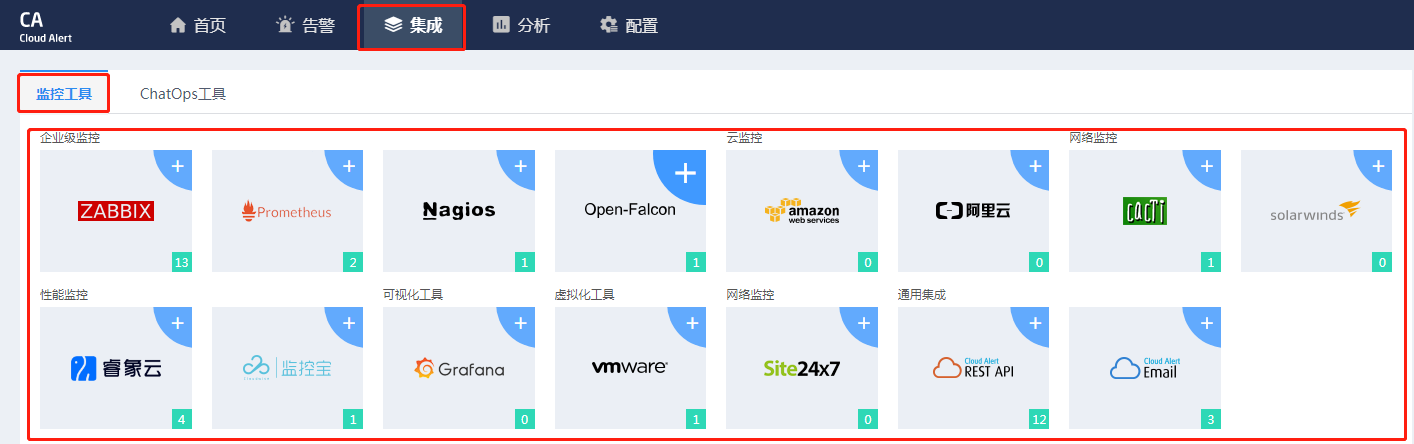 进入Cloud Alert,点击集成-监控工具,选择您的监控工具进行集成,目前支持的有Zabbix、Prometheus、Nagios、Open-Falcon、AWS、阿里云、Cacti、solarwinds、睿象云、监控宝、Grafana 、Vmware、Site24x7、如果上述都没有支持你的监控系统,那还可以用通用集成rest api和邮箱集成。