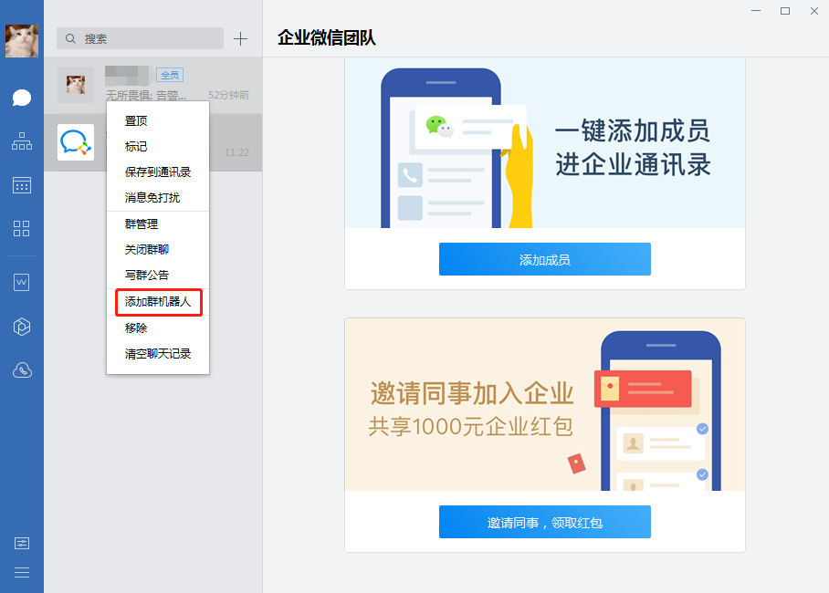 - 在PC端企业微信群中,右键点击群-添加群机器人