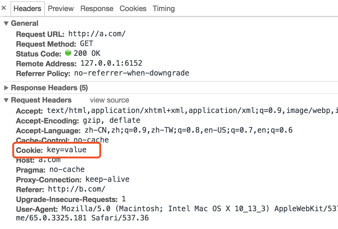 现在 b.com 的网页加载 a.com 的 css 文件时会携带该 cookie,如下: