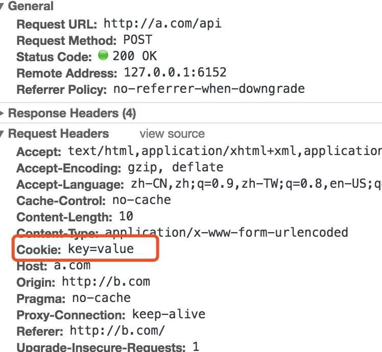b.com 的网页中的表单向 a.com 中的接口提交数据时也会携带该 cookie,如下: