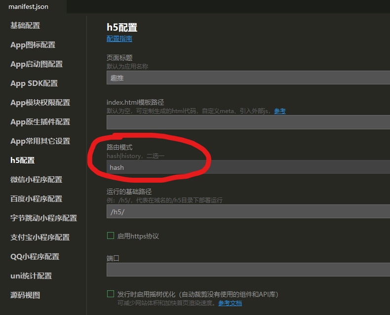编译软件:HBuilderX 至于打包的详细步骤,请参考uni-app官网,这里只说我遇到的坑 可能是我之前学vue脚手架的时候,路由都是history,然后我就配置里面选择了history, 这直接导致打包后,部署到服务器上,打开页面出现白屏,应该选择路由模式为hash,或者默认不选,这样部署到服务器上就会显示你的页面内容了。 来源:CSDN作者:爱风度链接:https://blog.csdn.net/qq_40476712/article/details/104820689 标签 软件 history