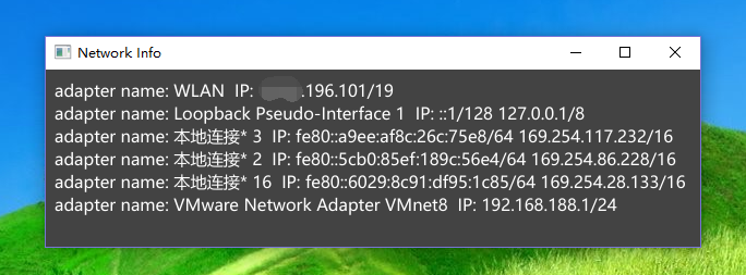 ipstring += "adapter name: " + k + " IP: " + v + "\n"
