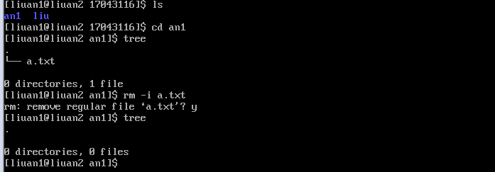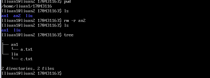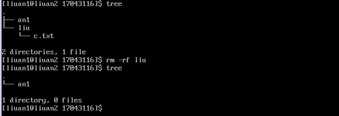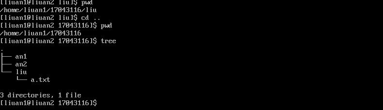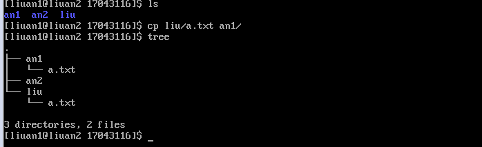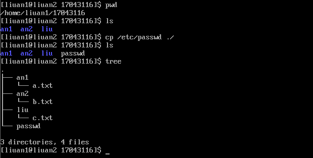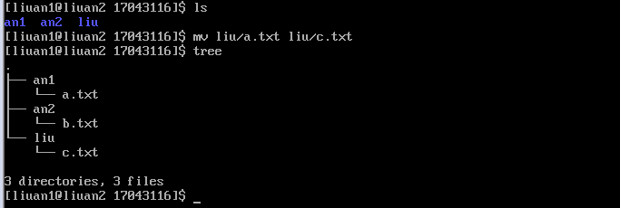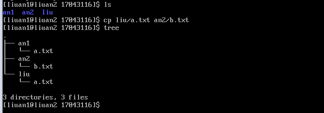 (7)把当前目录的liu目录中文件a.txt复制到an1目录中,然后再次把liu目录中的a.txt复制到an2目录并命名为b.txt,最后把liu目录中文件a.txt重命名为c.txt。通过tree命令查看当前目录情况
