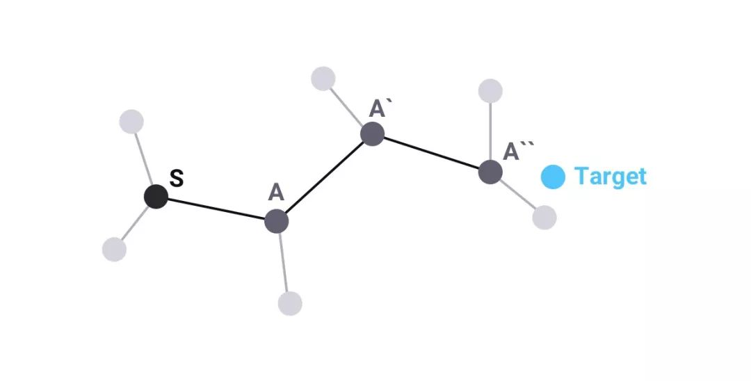 近邻图的特性可以粗略理解成:构建一张图,每一个顶点连接着最近的N个顶点。它的搜索过程可见下图,Target是待查询的向量。在搜索时,由于无法知道该从图的哪个区域开始搜索,所以我们选择任意一个顶点S出发。首先遍历S的邻居,找到距离与 Target 最近的A节点,将A设置为起始节点,再从A节点出发进行遍历,反复迭代,不断逼近,最后找到与 Target 距离最近的节点A``时搜索结束。