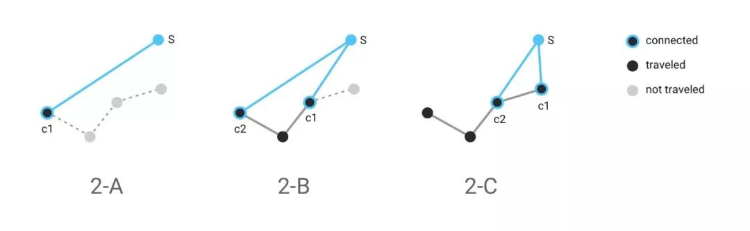 让我们来看看插入操作。新节点在插入到图中任意位置后,会建立 candidate pool,它用来保存所有搜索过的节点。首先将插入位置附近的节点加入到 pool 中,从 pool 中挑选出距离最近的节点,再从它出发寻找更近的节点,找到后将其加入到 pool 中(下图2-A到2-B),如果此节点都已搜索完毕,则挑选 pool 中的下一个节点进行搜索,不断循环N次,直至搜索到了 pool 的尾部,此时算法结束。在此过程中,如果pool满了但却发现了更近的节点,那么将它插入到 pool 中,剔除最远的节点,并且从新插入的位置处重新开始搜索(下图2-B到2-C)。这样减少了边的数量,改善了局部图的导航性。