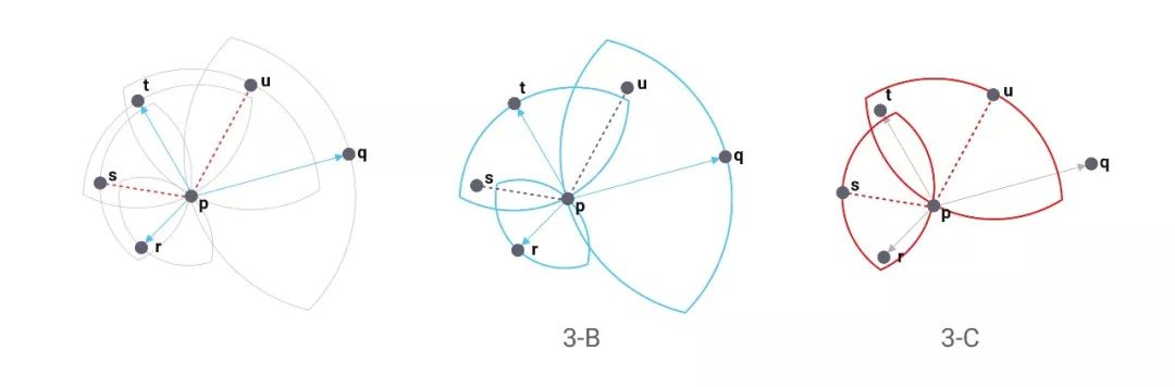 NSG 使用的择边策略与 HNSW 类似,但是不同于 HNSW 只选择最短边为有效边,NSG 使用的择边策略如下图。以点r为例,当r与p建立连接时,以r和p为圆心,r和p的距离为半径,分别做圆,如果两个圆的交集内没有其他与p相连接的点,则r与p相连(见图3-B)。在连接点s时,由于以s和p距离为半径的交集圆内,已有点r与p相连,所以s和p不相连(见图3-C)。下图中最终与点p相连的点只有r, t 和 q(见图3-A)。