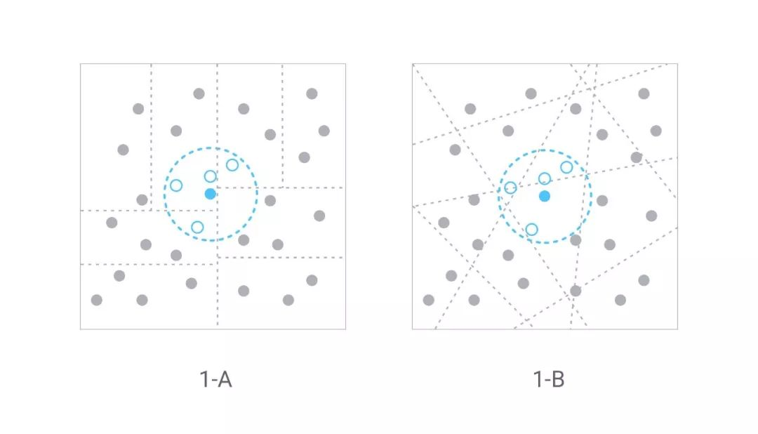 这里先介绍一下现在常用的索引类型以及它们的局限性。首先是基于树的算法,这里举例较为经典的 KD-tree。这种索引类型在向量维度稍大一些的情况下 (d>10),索引性能会急剧下降甚至不如暴力搜索。再说说基于 LSH (locality-sensitive hashing) 的索引,如果想要取得高召回率,LSH算法必须要建立大量的Hash表,这会使得索引大小膨胀数倍。不仅如此,树和LSH都属于空间切分类算法,此类算法有一个无法避免的缺陷,即为了提高搜索精度,只能增大搜索空间。图1-A描述了基于树的切分搜索,每个虚线分割出的区域是一个子树,如果搜索向量在子树的边缘时,算法需要搜索多个子树来获取结果。图1-B描述了基于 Hash 的切分搜索,虚线描述了每个独立的hash表,搜索面临的问题与基于树的搜索算法类似。所以空间切分类算法在最坏的情况下需要扫描几乎整个数据集,这在很多场景下显然是无法接受的。