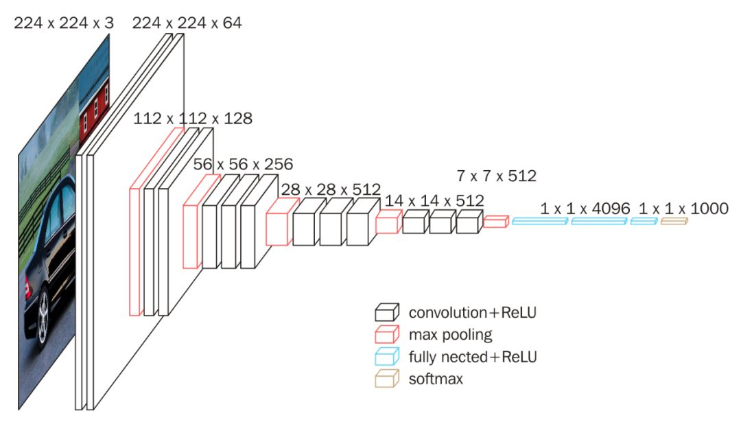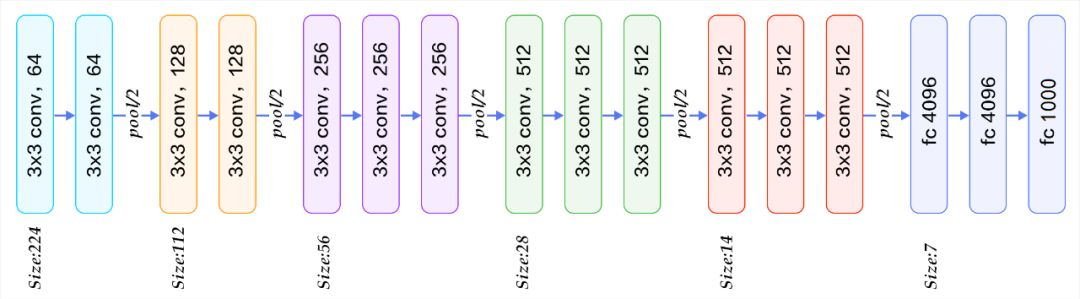 VGGNet 探索了 CNN 的深度及其性能之间的关系,通过反复堆叠 3*3 的小型卷积核和 2*2 的最大池化层, VGGNet 成功地构筑了 16-19 层深的 CNN 。在本方案中使用了 Keras 的应用模块( keras.applications )提供的 VGG16 模型。