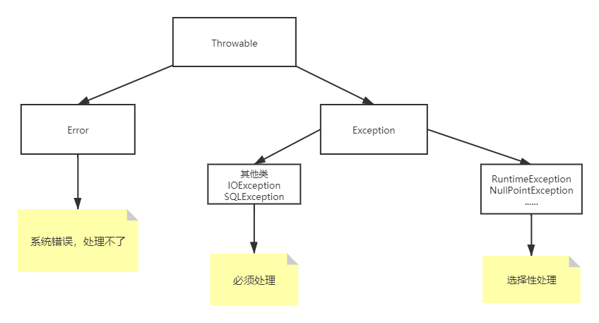 - 继承 Exception 的其他类:必须捕获,通常在 API 文档中会说明这些方法抛出哪些异常。