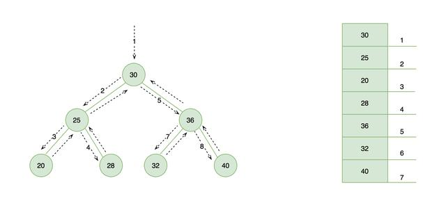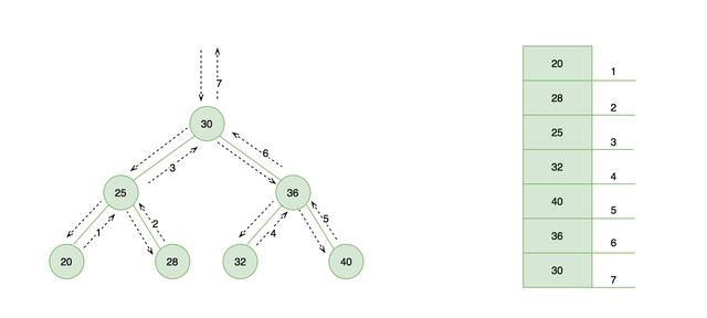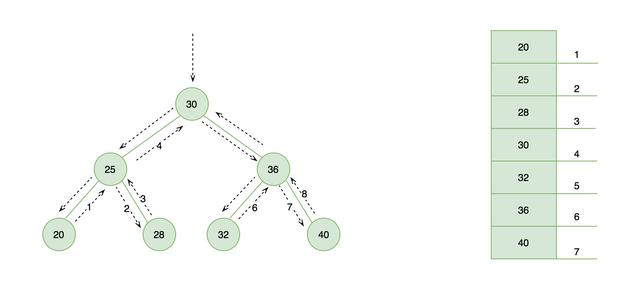 下图左侧展示了中序遍历的访问路径,右侧为其输出结果是一个从小到大的顺序排列。