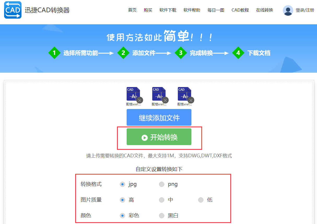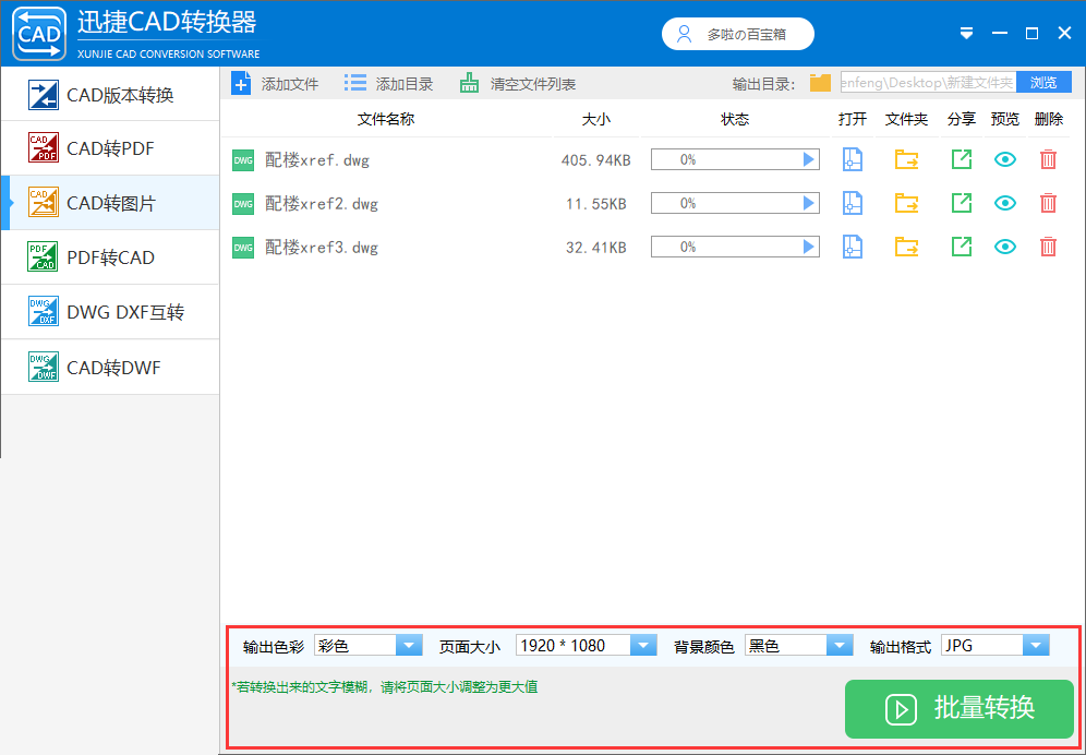 文件添加后调整底部的四大参数,调整时注意把输出格式的参数修改为所需的jpg格式,而后点击批量转换按钮就可以将添加的cad转jpg格式了。