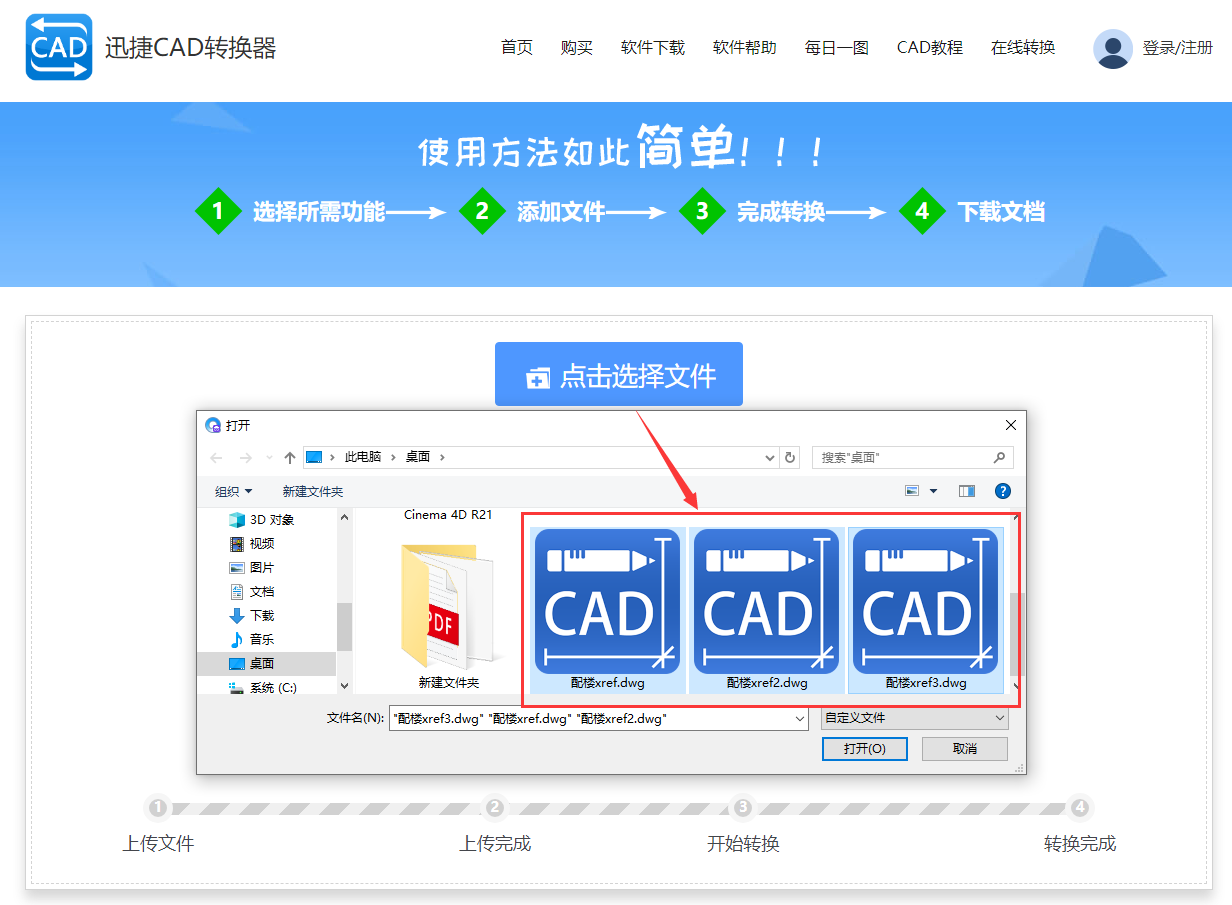 接着会切换到相应的转换界面,点击选择文件会出现一个添加文件的矩形框,在这里找到需要转换的cad文件添加到转换界面。