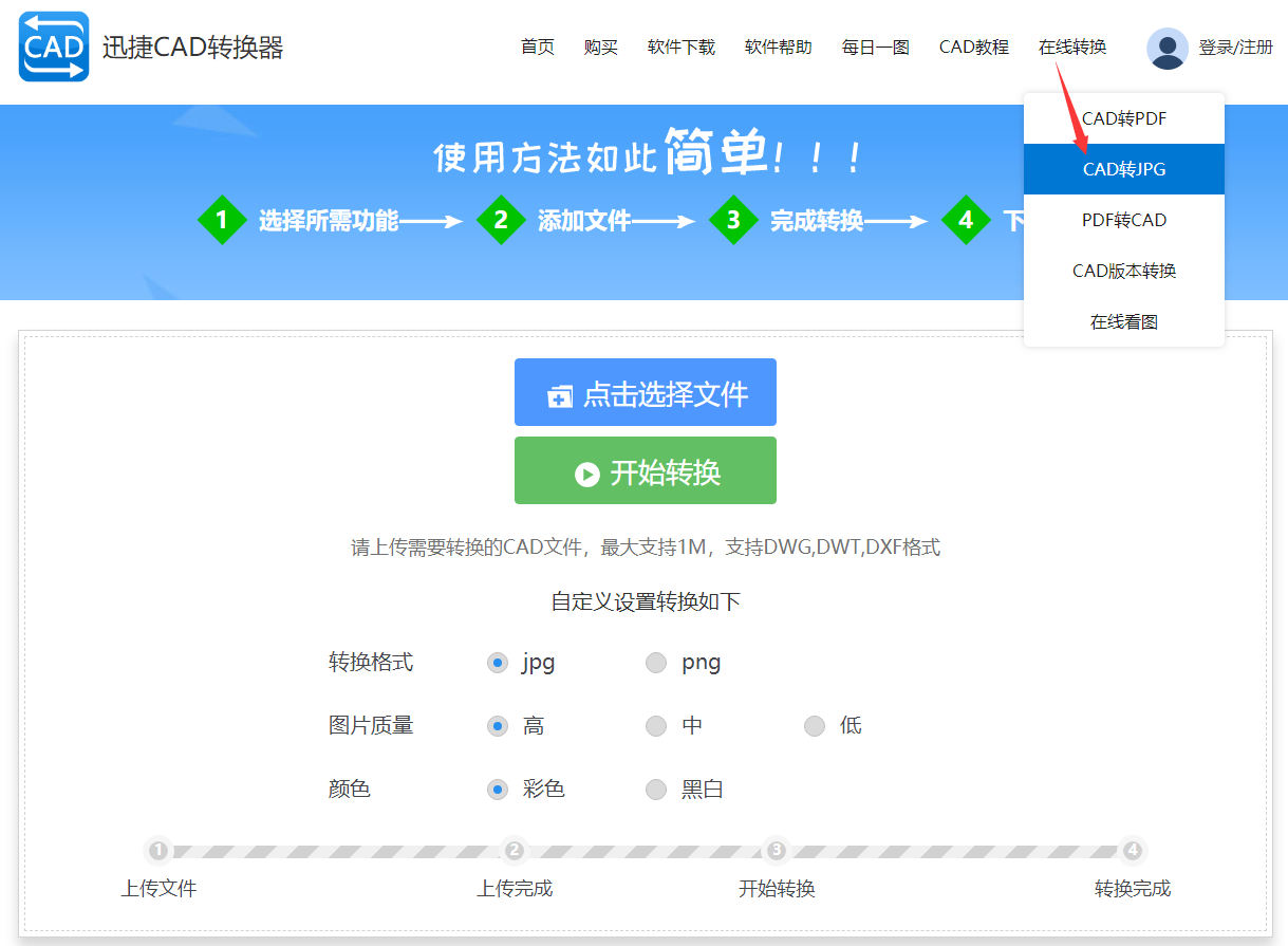 除了cad转换器外还可以用在线转换的方式将cad转jpg,而我们首先要选择导航栏在线转换系列的cad转jpg功能。