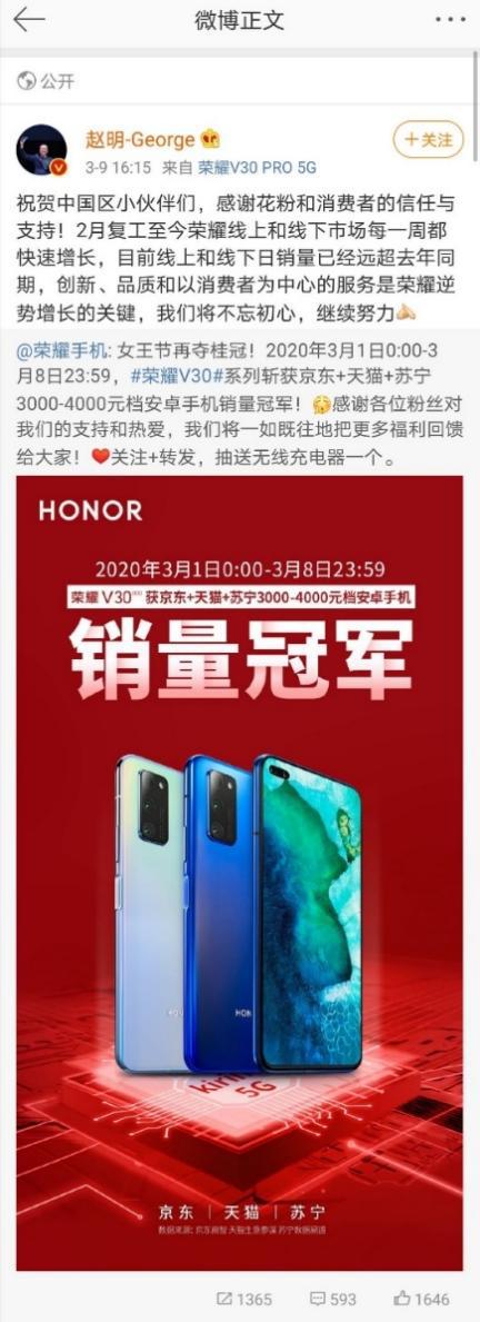 近日,荣耀总裁赵明发布一则微博,表示2月复工至今荣耀线上、线下市场每一周都有快速增长,且远超去年二月份同期,并且还配上一张荣耀V30三月份连续一周获得了电商平台销售冠军的图片。最后赵明还表示荣耀将不忘初心,继续努力。如此积极的态度,这让消费者们对于荣耀十分看好。