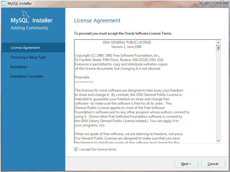 (2)在图1-8所示的窗口中单击“运行”按钮,进入MySQL Installer的协议许可协议界面,如图所示,选择I accept the license terms按钮,表示接受用户安装时的许可协议。