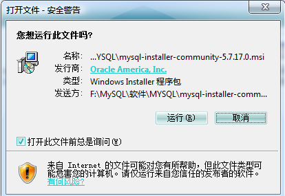 (1)双击MySQL安装程序(mysql-installer-community-5.7.17.0.msi),弹出如图所示的“打开文件-安全警告”窗口。