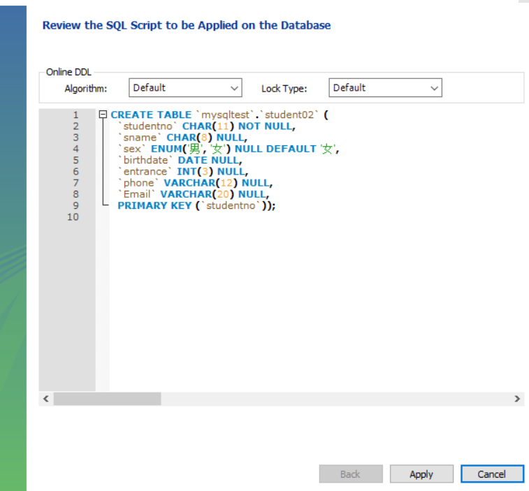 ②单击Apply按钮,进入脚本审核对话框。可以再次编辑创建数据表的文本。