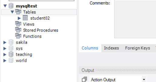 ④单击Finish按钮,完成数据表student02的创建。展开数据库mysqltest数据库中tables文件夹,即可查看到表student02。