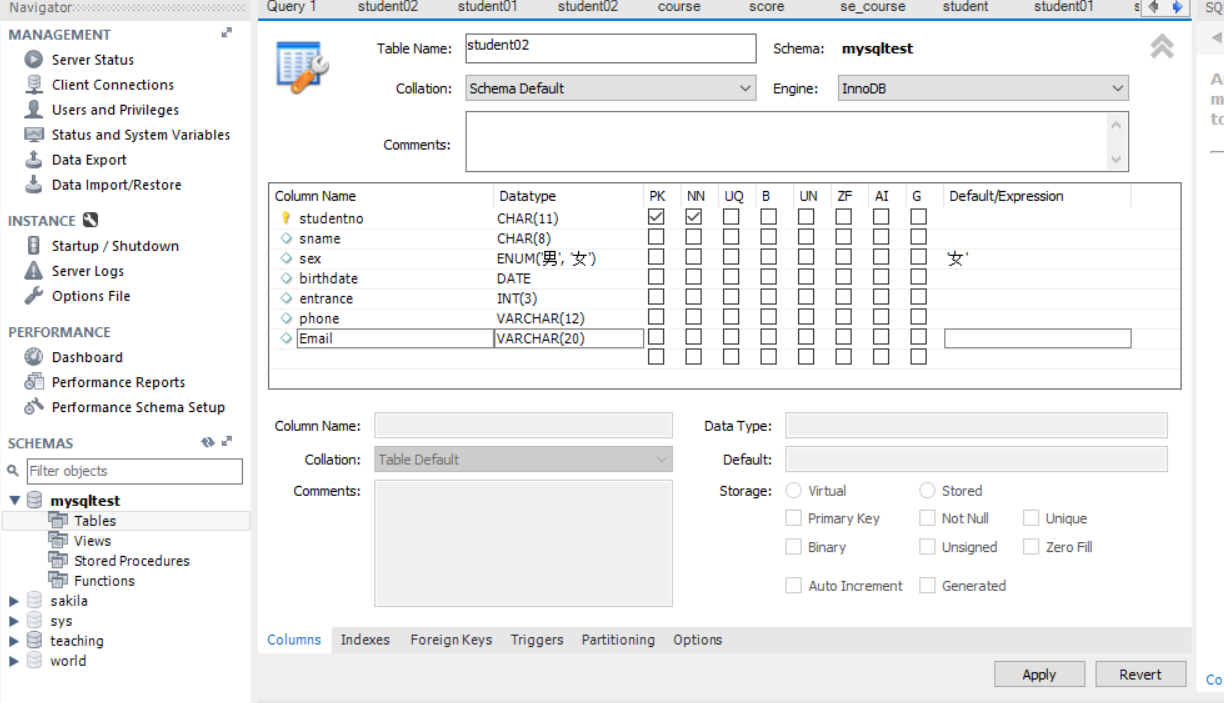 ①输入数据库表名student02,选择默认数据库引擎InnoDB,分别输入列名,选择数据类型,输入不同类型的参数或默认值