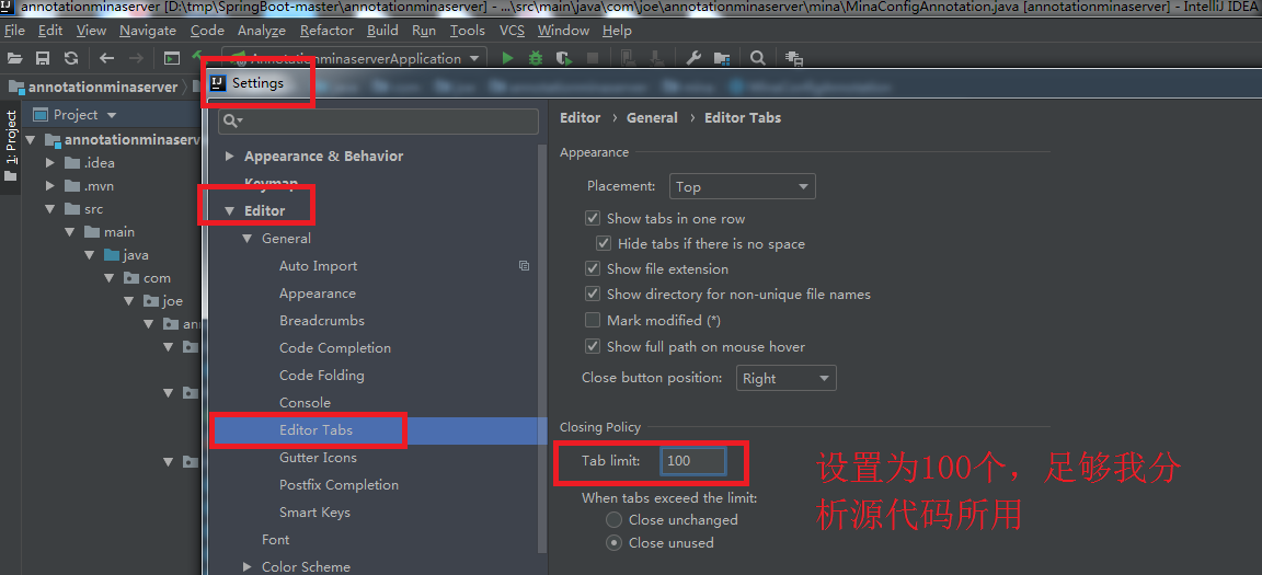 我在用idea研究MINA源码的时候,发现打开一些文件之后,以前打开的文件不见了,好麻烦,重新将限制设置为可以打开100个,这样足够我用的了: 来源:oschina链接:https://my.oschina.net/u/2963604/blog/3193898 标签 mina IntelliJ IDEA
