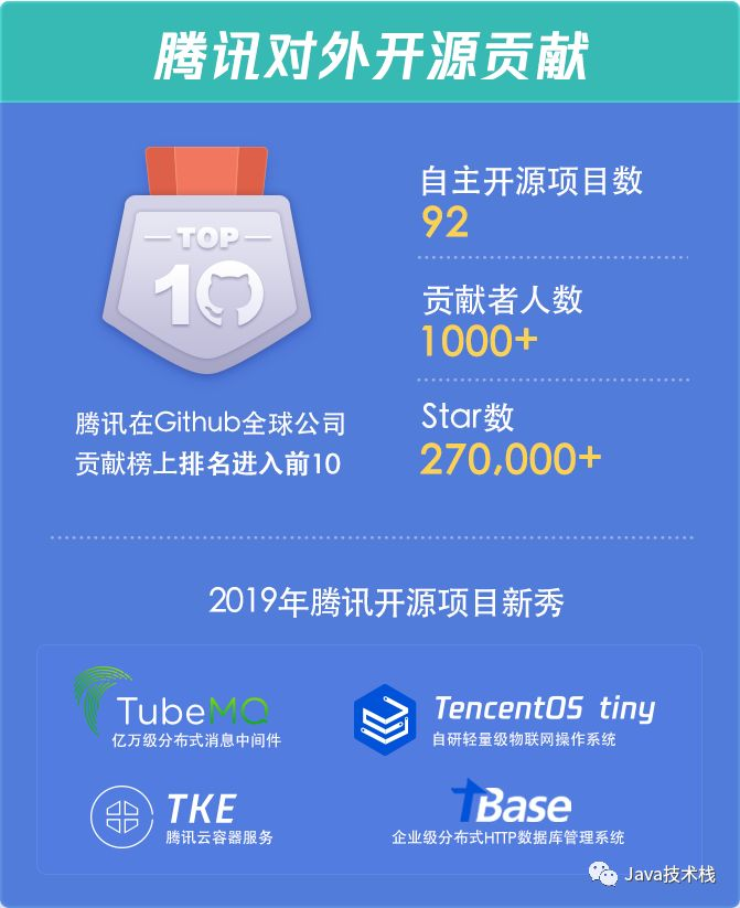 2019 年全年,腾讯开源超过 22 个项目,包括 TubeMQ 亿万级分布式消息中间件、TencentOS tiny 自研轻量级物联网操作系统、TKE 腾讯云容器服务和 TBase 企业级分布式 HTTP 数据库管理系统等。