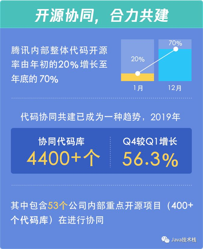 在内部开源方面,腾讯内部整体代码开源率由 2019 年年初的 20% 增长至年底的 70%。其中,2019 年腾讯内部新增协同代码库超过 4400 个,Q4 较 Q1 增长了 56.3%。其中包含 53 个公司内部重点开源项目(涉及 400 多个代码库)在进行协同。