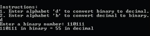 printf("2. Enter alphabet 'b' to convert decimal to binary.\n");