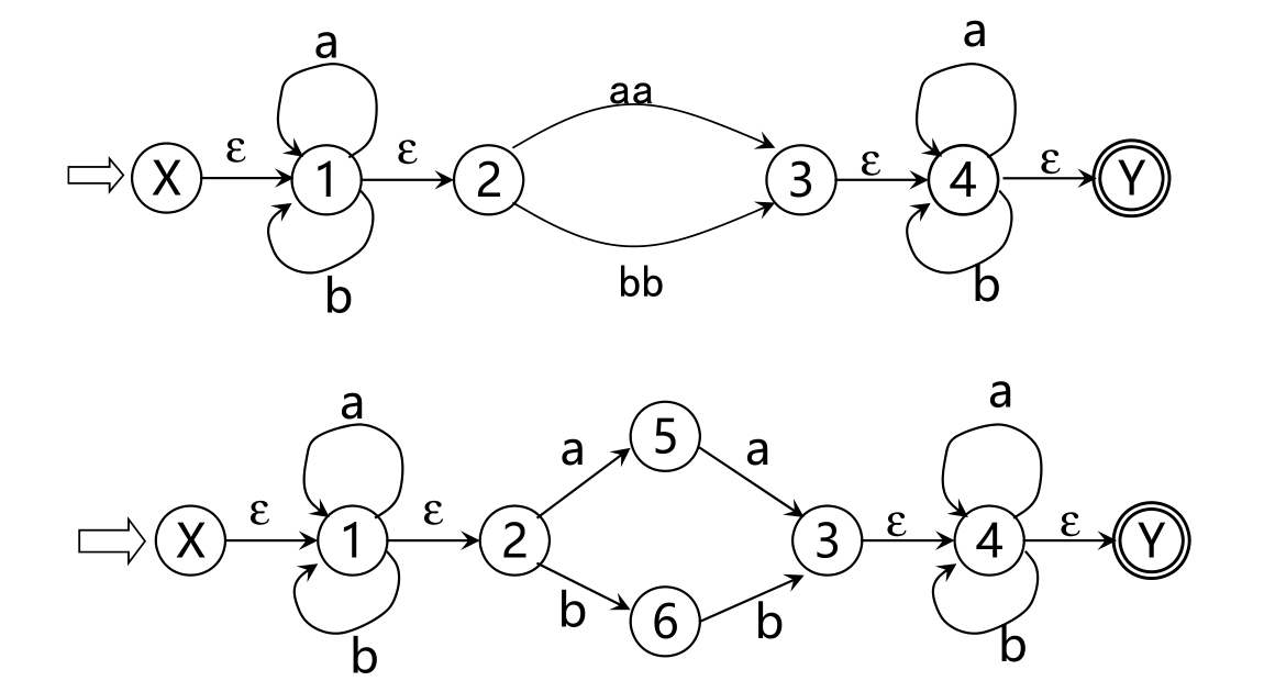 总来时就是两步走,第一步加入唯一的初态,第二步就是引入中间节点,将弧上的标记拆分成单字符