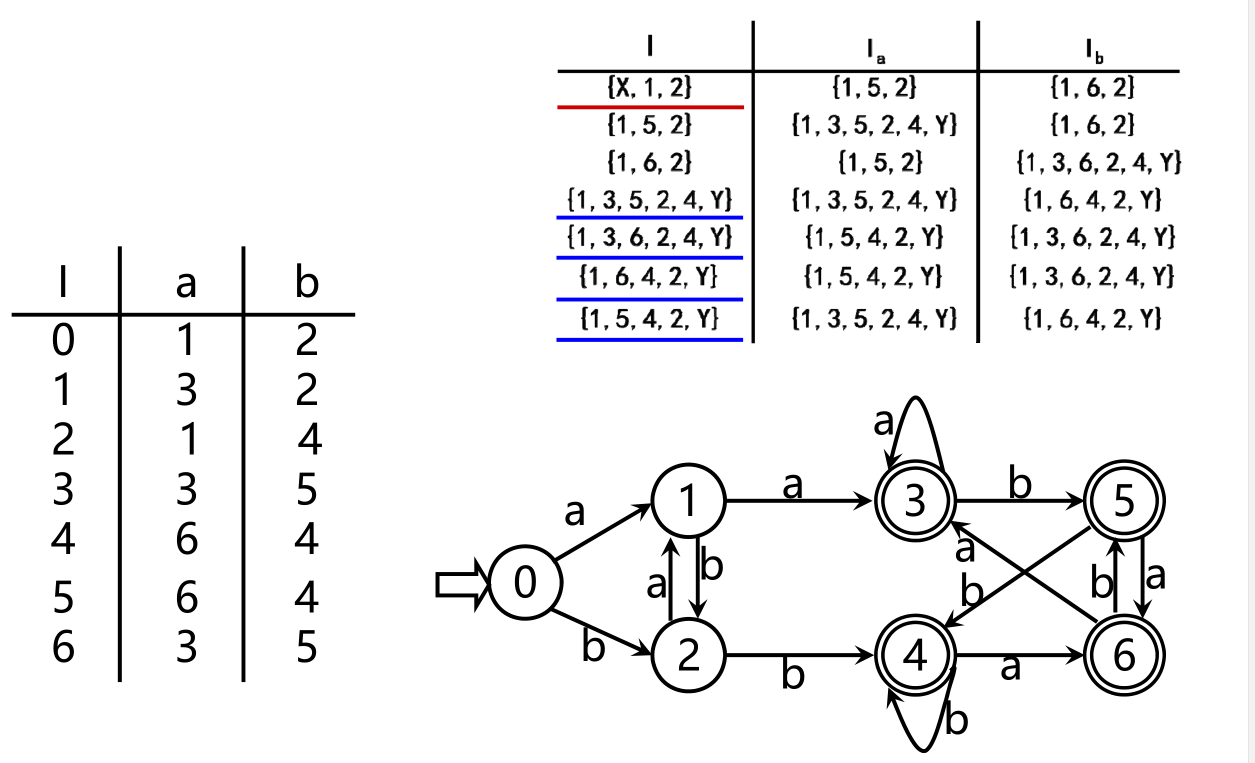 - 然后,检查这两个I a ,I b ,看它们是否已在表中的第一列中出现,把未曾出现的填入后面的空行的第1列上,求出每行第2,3列上的集合...
