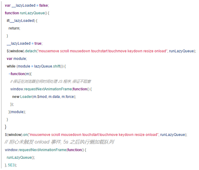 如果用户没有交互,但是页面已经 onload 了,程序当然不能浪费这个绝佳的空档机会,趁机加载内容;经测试,部分情况下,onload 事件没有触发(原因尚不知),所以还设定了一个超时加载,5s 之后,不论页面加载情况如何,都会将剩下的非关键模块加入到懒加载监控。