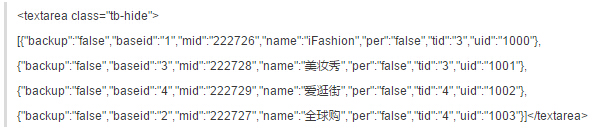 如果模块是异步展示的,可以通过 tms-datakey 找到模块数据,而首页的个性化是从几十上百个模块中通过算法选出几个,如果把这些模块钩子全部输出来,虽说取数据方便了很多,却存在大量的冗余,对此的优化策略是:将数据格式相同的模块单独拿出来,新建页面作为数据页。所以可以在源码中看到好几段这样的配置信息: