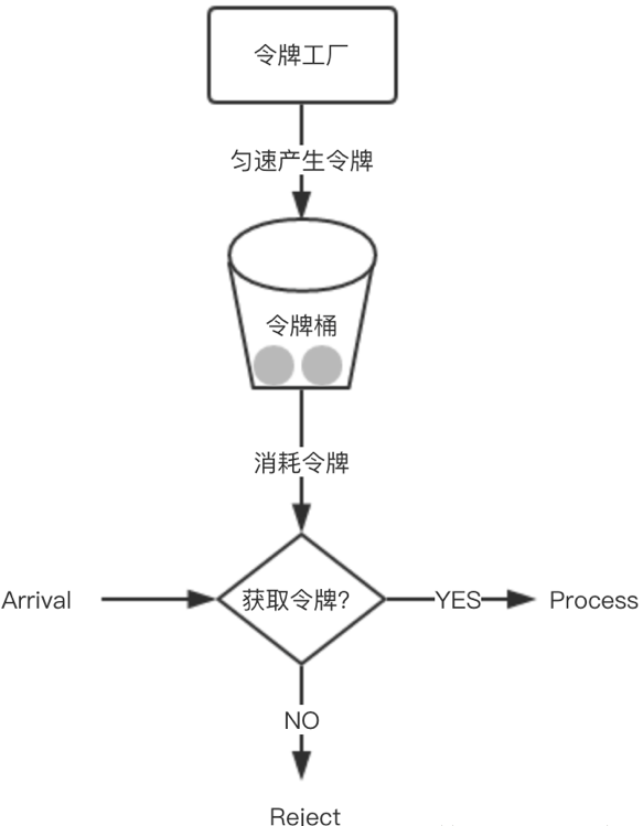 放令牌这个动作是持续不断的进行,如果桶中令牌数达到上限,就丢弃令牌,所以就存在这种情况,桶中一直有大量的可用令牌,这时进来的请求就可以直接拿到令牌执行,比如设置qps为100,那么限流器初始化完成一秒后,桶中就已经有100个令牌了,这时服务还没完全启动好,等启动完成对外提供服务时,该限流器可以抵挡瞬时的100个请求。所以,只有桶中没有令牌时,请求才会进行等待,最后相当于以一定的速率执行。