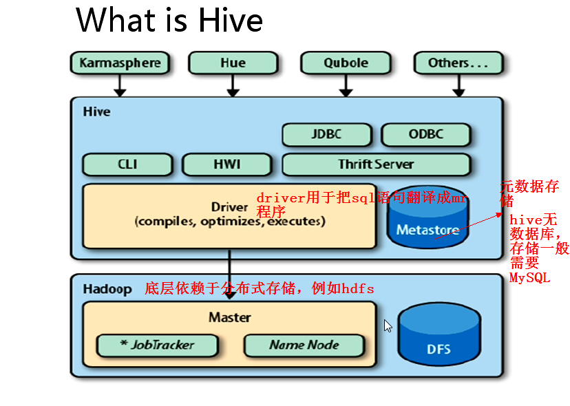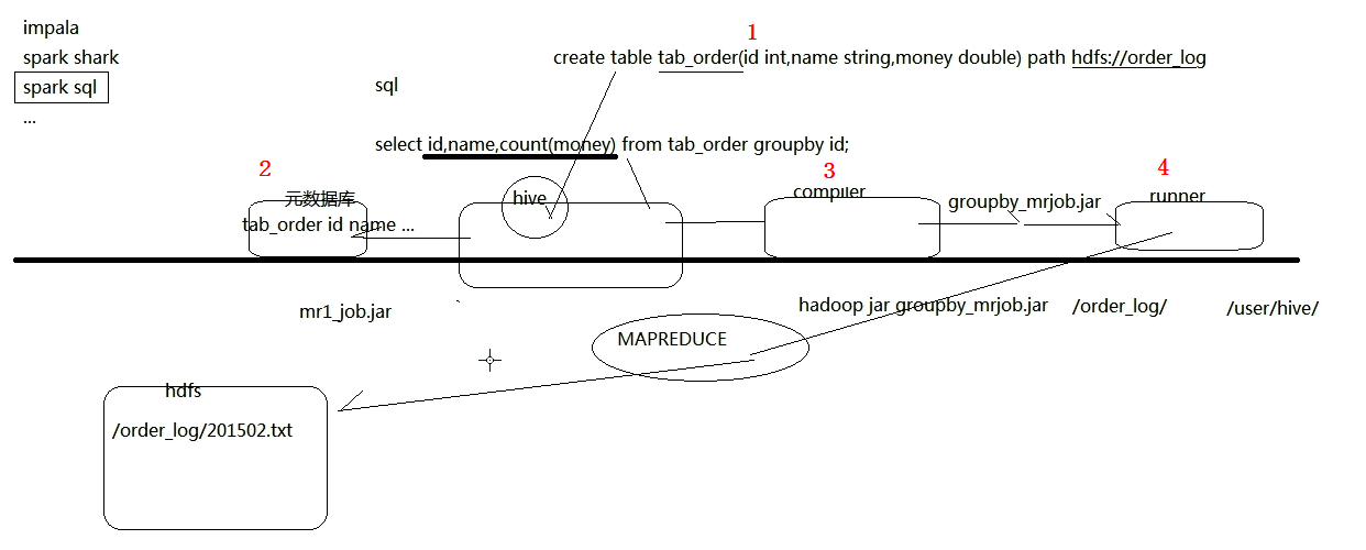 - hive创建出一个表,关联文件存储路径,放到元数据库中,在根据sql语句的类型编译出相应的MapReduce程序,就可以得到一个可以运行的程序传给执行器,就可以根据hadoop命令提交到集群中,这样就无需自己写MapReduce程序,只需要写SQL语句就可以