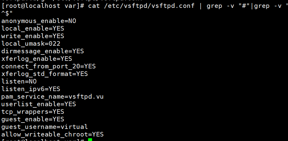 [root@localhost ~]# grep -v "#" /etc/vsftpd/vsftpd.conf |grep -v "^$"