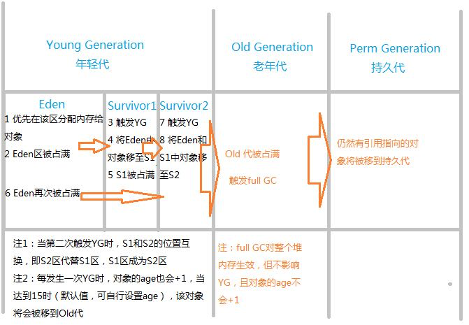 堆中new对象首先进入Eden区,当Eden区满了之后,会触发Young GC 判断Eden区中的对象是否还有指向其的引用,如果没有则被直接回收,如果还有引用指向则将其移入survivor1区;之后当Eden区再次满了时会触发第二次Young GC 判断Eden区中的对象是否还有指向其的引用,如果没有则被直接回收,如果还有引用指向则将其移入survivor2区,同时会判断survivor1区中对象是否还有指向其的引用,如果没有直接回收除,有将其移至survivor2区(第二次Young GC 的时候相当于回收说有无引用的对象同时 s1与s2位置互换);Young GC 循环奖Eden区的对象存入survivor区,而每执行一次age+1,JVM 默认age=15,当age=15之后出发Young GC时将其移入老年代,老年代不断的被移入数据,当老年区满了的时候 触发 full GC ,full GC将对整个堆进行GC,没有引用直接回收,有引用则移入持久代(1.8及以后没有永久代用元空间替代),full GC 不影响Young GC 也不影响对象age