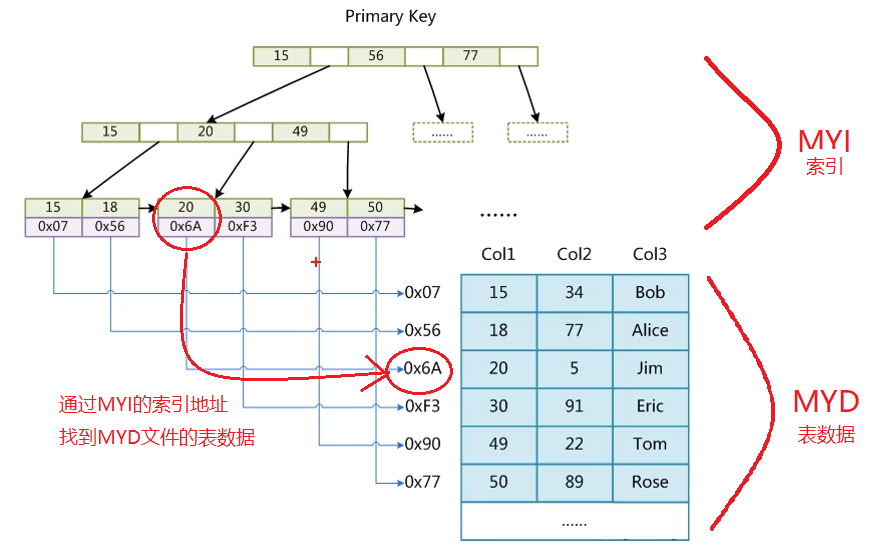 当一个查询带有索引,得先通过MYI文件(B+TREE)读取到该条数据的磁盘文件指针,因此再在MYD文件中获取到该条数据。如果查询条件不是索引,则直接去MYD文件去找,做全表扫描,效率低下。