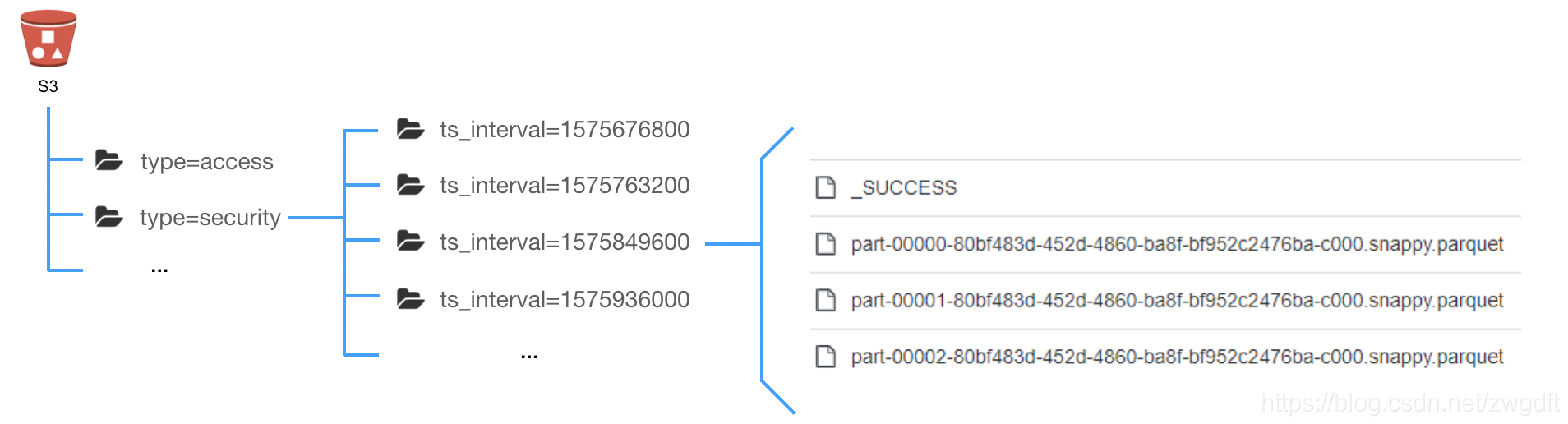 在加载Parquet文件时,Spark会先建立InMemoryFileIndex、推导Schema。建立InMemoryFileIndex,是指枚举指定路径下的文件,获取相应的Partition与文件路径信息。比如,下图中 s3://mydata/type=security 路径下有4个ts_interval的Partition,每个Partition下有3个Parquet。这些信息会缓存在Spark Driver中,用于后续的Pushdown Filter、访问文件等。