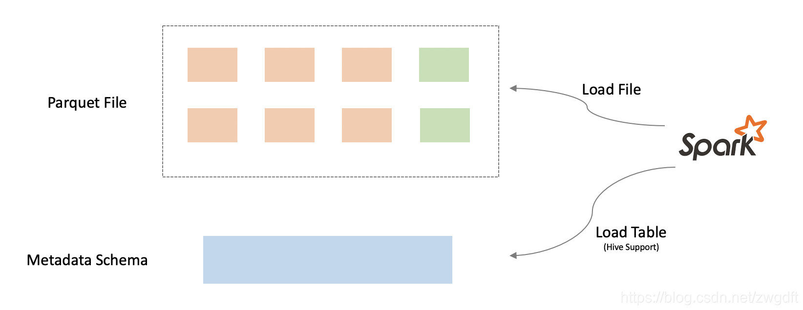 在Spark中操作Parquet文件有两种方式,一种是直接加载文件,另一种是透过Hive表来读取数据。我们姑且称之为文件加载、表加载。这两种方式在API层面都非常简洁,它隐藏了底层推导Schema、并行加载数据等细节。