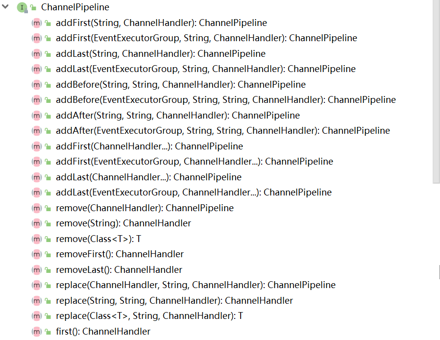Netty对负责处理接口做了更细粒度的划分,处理器被分为两种,一种是入栈处理器 ChannelInboundHandler,另外一种是出栈处理器ChannelOutboundHandler,这两个接口都继承ChannelHandler接口。所有的处理都添加在Pipeline上。所以,添加删除责任处理器的接口行为都在ChannelPipeline中进行了规定: