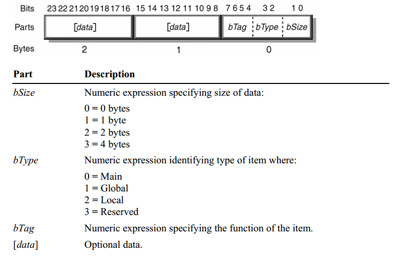 | Logical Minimum | 0001 01 nn | 逻辑单元中的范围值。 这是变量或数组项将报告的最小值。 例如,报告x位置值从0到128的鼠标的逻辑最小值为0,逻辑最大值为128。 |